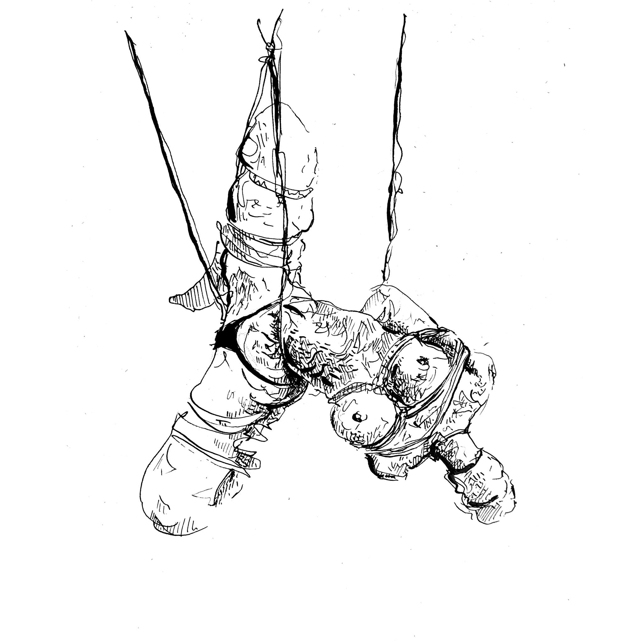 Am vorangehenden Donnerstag, den 15. Juli, fesseln sie für das Live-Drawing und präsentieren in zweimal 40 Minuten – immer wieder von Ruhepositionen zum Zeichnen unterbrochen – Tams Stil, “a mix between more ’classical’ erotic japanese semenawa (tormenting rope) and the wildly deconstructed styles of some European riggers.”